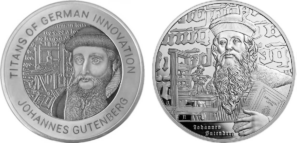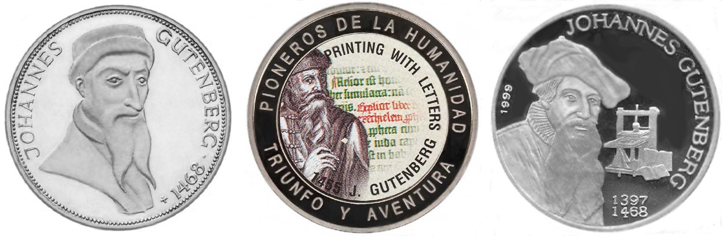 Иоганн Гутенберг (1394/99-1468) - изобретатель новаторского способа книгопечатания подвижными литерами, оказавшего огромное влияние на мировую культуру. В Германии монету 5 марок выпустили к 500-летию его смерти (1968). Монета САДР 1000 песет, посвящённая первопечатнику, вышла в 1997 году; через два года монета 1000 франков появилась в Бенине.