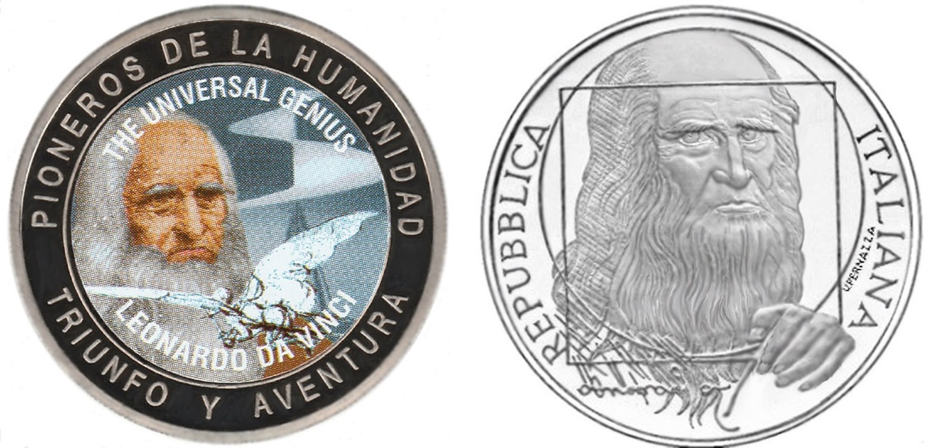 Леонардо да Винчи (1452-1519) - итальянский художник и учёный, изобретатель, писатель и музыкант, один из крупнейших представителей искусства эпохи Возрождения и классический пример универсального человека. Его портрет помещён на монете 1000 песет САДР, а также на итальянской монете 10 евро 2006 года.